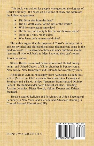 This book was written for people who question the dogmas of Christ's divinity. It's based on a lifetime of study and addresses the following questions:Did Jesus rise from the dead? Was his death an Atonement for sin? Will there be a Second Coming? Did Jesus come to earth from eternity? Does the Trinity really exist? Was Jesus both God and man? The author argues that the dogmas of Christ's divinity rest on ancient mythical and philosophical ideas that have no place in the modern world. His answers to these and other questions should reassure all who've left Eden and now look back, knowing they can't return.