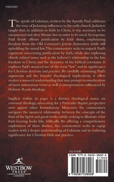 The epistle of Galatians, written by the Apostle Paul, addresses the issue of Judaizing influences in the early church. Judaizers taught that, in addition to faith in Christ, it was necessary to be circumcised and obey Mosaic law in order to be saved. In response, Paul firmly affirms justification by faith alone, emphasizing freedom from the Old Covenant's Jewish distinctives while still upholding the moral law. This commentary seeks to unpack Paul's argument concerning justification by faith, while also exploring closely related issues such as the believer's relationship to the law, freedom in Christ, and the dynamics of the biblical covenants. It explores Paul's nuanced use of the term "law" and its significance for Christian doctrine and practice. By carefully examining Paul's arguments and the broader theological implications, it offers readers a nuanced understanding that may prompt reconsideration of more antinomian views as well as interpretations influenced by Hebrew Roots theology. Implicit within its pages is a distinct theological stance on covenant theology, advocating for a Particular Baptist perspective over against other formulations. Moreover, the commentary navigates the nuanced relationship between the concepts of the fruit of the Spirit and good works, while seeking to illustrate what fruit-bearing looks like, biblically. By offering a comprehensive exploration of these themes, this commentary seeks to equip readers with a deeper understanding of Galatians and its enduring significance for Christian faith and practice.