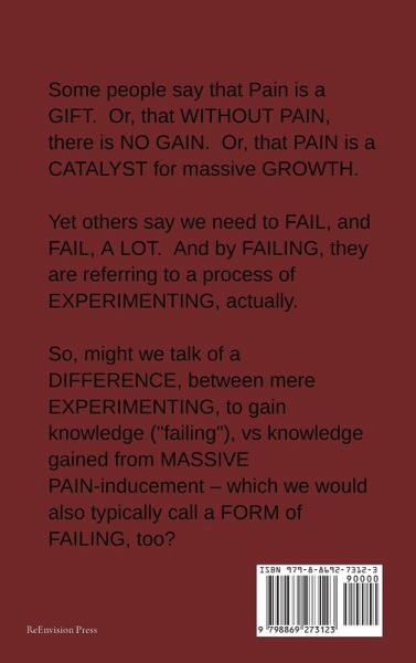 Some people say that Pain is a GIFT. Or, that WITHOUT PAIN, there is NO GAIN. Or, that PAIN is a CATALYST for massive GROWTH. Yet others say we need to FAIL, and FAIL, A LOT. And by FAILING, they are referring to a process of EXPERIMENTING, actually. So, might we talk of a DIFFERENCE, between mere EXPERIMENTING, to gain knowledge ("failing"), vs knowledge gained from MASSIVE PAIN- inducement": which we would also typically call a FORM of FAILING, too?