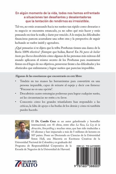 En algún momento de la vida, todos nos hemos enfrentado a situaciones tan desafiantes y desalentadoras que la tentación de rendirnos es irresistible. Tal vez, no estás avanzando hacia tus sueños tan rápido como desearías o tu negocio se encuentra estancado, ya no sabes qué más hacer y estás pensando en tirar la toalla y darte por vencido. A lo mejor, las dificultades financieras parecen acumularse una sobre otra y la perspectiva de seguir luchando se vuelve inútil y agotadora. ¿Qué pensarías si te dijera que la tribu Powhatan tienen una danza de la lluvia 100% efectiva? ¡Siempre que bailan, llueve! En No pares de bailar hasta que llueva descubrirás cómo algunas de las personas más exitosas del mundo aplicaron el mismo secreto de los Powhatan para mantenerse firmes en el logro de sus objetivos, perseverar frente a las dificultades y los obstáculos que enfrentaron y lograr sueños que parecían imposibles. Algunas de las enseñanzas que encontrarás en este libro: ¿ Tendrás en tus manos las herramientas para convertirte en una persona imparable, capaz de mirarte al espejo y decir con firmeza: "Fracasar no es una opción". ¿ Descubrirás cuatro estrategias poderosas para lograr cualquier sueño, así las circunstancias no estén a tu favor. ¿ Conocerás cómo los grandes triunfadores han respondido a las críticas, la falta de apoyo o las burlas de los demás y cómo tú también puedes hacerlo.