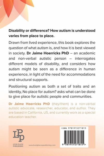 Disability or difference? How autism is understood varies from place to place. Drawn from lived experience, this book explores the question of what autism is, and how it is best viewed in society. Dr Jim Hoerricks PhD - an academic and non-verbal autistic person - interrogates different models of disability, and considers how autism might be seen as a difference in human experience, in light of the need for accommodations and structural supports. Positioning autism as both a set of traits and an identity, No place for autism? asks what can be done to give place for autistic people and communities.
