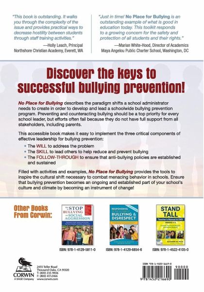 Discover the keys to successful bullying prevention! This book describes the paradigm shifts a school leader needs to create in order to develop and lead a schoolwide bullying prevention program. Anti-bullying efforts often fail because they do not have full support from every school stakeholder, including parents. This accessible book makes it easy to implement the three critical components of effective leadership for bullying prevention: The WILL to address the problem The SKILL to lead others to help reduce and prevent bullying The FOLLOW-THROUGH for ensuring anti-bullying policies are established and sustained