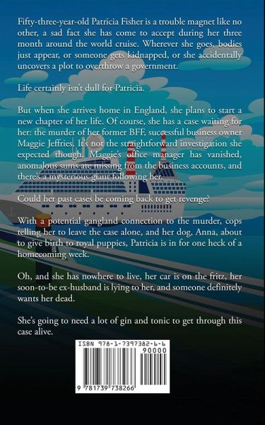 Fifty-three-year-old Patricia Fisher is a trouble magnet like no other, a sad fact she has come to accept during her three month around the world cruise. Wherever she goes, bodies just appear, or someone gets kidnapped, or she accidentally uncovers a plot to overthrow a government. Life certainly isn't dull for Patricia. However, when she arrives home in England, she plans to start a new chapter of her life. Of course, she has a case waiting for her: the murder of her former BFF, successful business owner Maggie Jeffries. It's not the straightforward investigation she expected though. Maggie's office manager has vanished, anomalous sums are missing from the business accounts, and there's a mysterious giant following her. Could her past cases be coming back to get revenge? With a potential gangland connection to the murder, cops telling her to leave the case alone, and her dog, Anna, about to give birth to royal puppies, Patricia is in for one heck of a homecoming week. Oh, and she has nowhere to live, her car is on the fritz, her soon-to-be ex-husband is lying to her, and someone definitely wants her dead. She's going to need a lot of gin and tonic to get through this case alive.