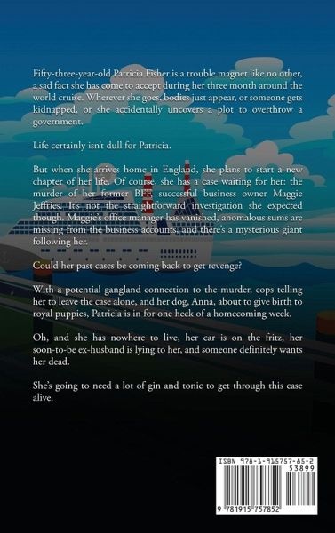 Fifty-three-year-old Patricia Fisher is a trouble magnet like no other, a sad fact she has come to accept during her three month around the world cruise. Wherever she goes, bodies just appear, or someone gets kidnapped, or she accidentally uncovers a plot to overthrow a government. Life certainly isn't dull for Patricia. However, when she arrives home in England, she plans to start a new chapter of her life. Of course, she has a case waiting for her: the murder of her former BFF, successful business owner Maggie Jeffries. It's not the straightforward investigation she expected though. Maggie's office manager has vanished, anomalous sums are missing from the business accounts, and there's a mysterious giant following her. Could her past cases be coming back to get revenge? With a potential gangland connection to the murder, cops telling her to leave the case alone, and her dog, Anna, about to give birth to royal puppies, Patricia is in for one heck of a homecoming week. Oh, and she has nowhere to live, her car is on the fritz, her soon-to-be ex-husband is lying to her, and someone definitely wants her dead. She's going to need a lot of gin and tonic to get through this case alive.