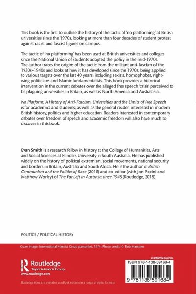 "Evan Smith's thoroughly researched and highly engaging new book, places 'no-platform' into its proper historical context and charts the ways it has, as a tactic and a policy, been changed and contested over the course of the twentieth century. The book...makes use of the student press, left-wing publications, parliamentary debates, and other sources in order to demonstrate 'no-platform' has a much longer and more complex history than current discourse acknowledges whilst avoiding being merely a polemic on the contemporary situation." - Hallam Roffey, Twentieth Century British History.