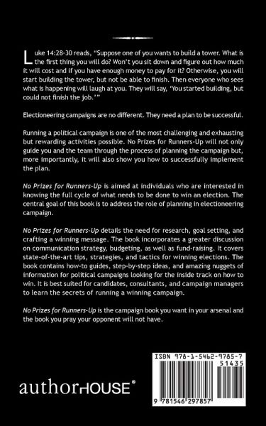 Luke 14:28-30 reads, "Suppose one of you wants to build a tower. What is the first thing you will do? Won't you sit down and figure out how much it will cost and if you have enough money to pay for it? Otherwise, you will start building the tower, but not be able to finish. Then everyone who sees what is happening will laugh at you. They will say, 'You started building, but could not finish the job.'" Electioneering campaigns are no different. They need a plan to be successful. Running a political campaign is one of the most challenging and exhausting but rewarding activities possible. No Prizes for Runners-Up will not only guide you and the team through the process of planning the campaign but, more importantly, it will also show you how to successfully implement the plan. No Prizes for Runners-Up is aimed at individuals who are interested in knowing the full cycle of what needs to be done to win an election. The central goal of this book is to address the role of planning in electioneering campaign. No Prizes for Runners-Up details the need for research, goal setting, and crafting a winning message. The book incorporates a greater discussion on communication strategy, budgeting, as well as fund-raising. It covers state-of-the-art tips, strategies, and tactics for winning elections. The book contains how-to guides, step-by-step ideas, and amazing nuggets of information for political campaigns looking for the inside track on how to win. It is best suited for candidates, consultants, and campaign managers to learn the secrets of running a winning campaign. No Prizes for Runners-Up is the campaign book you want in your arsenal and the book you pray your opponent will not have.