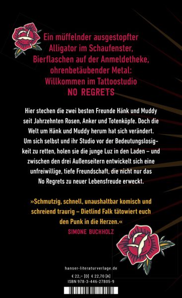 Ein hinreißender Roman über Freundschaft und Freiheit - und darüber, wie man beides wiederfindet, wenn es einem abhandengekommen ist."Das ist schmutzig, schnell, unaushaltbar komisch und schreiend traurig, einfach richtig gut kaputt - Dietlind Falk tätowiert euch den Punk in die Herzen." Simone Buchholz Ein müffelnder ausgestopfter Alligator im Schaufenster, leere Bierflaschen auf der Anmeldungstheke, ohrenbetäubender Metal: Willkommen im Tattoostudio NO REGRETS. Hier, irgendwo zwischen Dortmund und Duisburg, stechen die zwei besten Freunde Hänk und Muddy seit Jahrzehnten Rosen, Anker, Fußballvereinswappen und Totenköpfe. Doch die Welt um Hänk und Muddy herum hat sich verändert, und die beiden abgehalfterten Typen sind Auslaufmodelle geworden. Um das NO REGRETS vor dem Ruin zu retten, holen sie die junge Luz in den Laden - und zwischen den drei Außenseitern entwickelt sich eine unfreiwillige, tiefe Freundschaft, die nicht nur das NO REGRETS mit neuer Lebensfreude erfüllt.