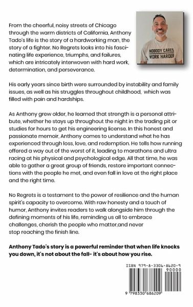 His early years since birth were surrounded by instability and family issues, as well as his struggles throughout childhood, which was filled with pain and hardships. As Anthony grew older, he learned that strength is a personal attribute, whether he stays up throughout the night in the trading pit or studies for hours to get his engineering license. In this honest and passionate memoir, Anthony comes to understand what he has experienced through loss, love, and redemption. He tells how running offered a way out of the worst of it, leading to marathons and ultra racing at his physical and psychological edge. All that time, he was able to gather a great group of friends, restore important connections with the people he met, and even fall in love at the right place and the right time. No Regrets is a testament to the power of resilience and the human spirit's capacity to overcome. With raw honesty and a touch of humor, Anthony invites readers to walk alongside him through the defining moments of his life, reminding us all to embrace challenges, cherish the people who matter, and never stop reaching the finish line. Anthony Tado's story is a powerful reminder that when life knocks you down, it's not about the fall-it's about how you rise.