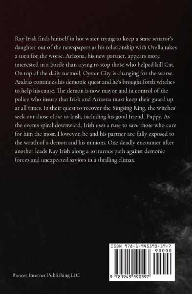 Ray Irish finds himself in hot water trying to keep a state senator's daughter out of the newspapers as his relationship with Orella takes a turn for the worse. Arizona, his new partner, appears more interested in a bottle than trying to stop those who helped kill Cat. On top of the daily turmoil, Oyster City is changing for the worse. Andras continues his demonic quest and he's brought forth witches to help his cause. The demon is now mayor and in control of the police who insure that Irish and Arizona must keep their guard up at all times. In their quest to recover the Singsing Ring, the witches seek out those close to Irish, including his good friend, Pappy. As the events spiral downward, Irish uses a ruse to save those who care for him the most. However, he and his partner are fully exposed to the wrath of a demon and his minions. One deadly encounter after another leads Ray Irish along a torturous path against demonic forces and unexpected saviors in a thrilling climax.