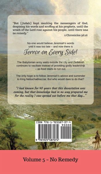 Terror on Every Side! The Life of Jeremiah: Volume 5 - No Remedy (Volume 5 of 6) by Mark Morgan (Bible Tales Online - www.BibleTales.online) "But [Judah] kept mocking the messengers of God, despising his words and scoffing at his prophets, until the wrath of the Lord rose against his people, until there was no remedy." 2 Chronicles 36:16 No-one would believe Jeremiah's words until it was too late - and then there was Terror on Every Side! The cruel Babylonian army waits outside the city and King Zedekiah can't make up his mind what to do. Jeremiah advises surrender, but has Zedekiah the courage to obey? Food and water are running out and Jeremiah's enemies blame him for the unfolding disaster. Will the king give them the opportunity they crave to punish Jeremiah? ...and time may be running out too, for if Nebuchadnezzar's soldiers can breach the city walls, what will happen next? Terror on Every Side! - The series The exciting but difficult life of Jeremiah - prophet and priest - is presented in this series. Working for God in ancient Israel,many of his struggles reflect our own as we live in the 21st century. The words of God came to Jeremiah as a fire, burning within him and appointing him a prophet to the nations. As a prophet of God for over 40 years, Jeremiah warned of the judgement which was to come on Judah and the nations around - yet few would listen. He lived to see most of the devastating prophecies fulfilled around him, but many of his unheeding audience did not. No-one would believe his words until it was too late - when there was Terror on Every Side! Previous volumes: ¿ Volume 1 - Early Days ¿ Volume 2 - As Good As It Gets ¿ Volume 3 - Darkness Falling ¿ Volume 4 - The Darkness Deepens Subsequent volume: ¿ Volume 6 - That Broken Reed