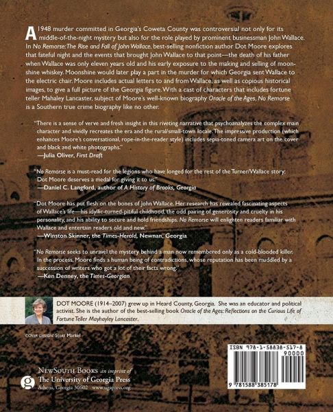 A 1948 murder committed in Georgia's Coweta County was controversial not only for its middle-of-the-night mystery but also for the role played by prominent businessman John Wallace. In No Remorse: The Rise and Fall of John Wallace, bestselling nonfiction author Dot Moore explores not only that fateful night, but also the events that brought John Wallace to that point-the death of his father when Wallace was only eleven years old, and his early exposure to the making and selling of moonshine whiskey. Moonshine would later play a part in the murder for which Georgia sent Wallace to the electric chair. Moore includes actual letters to and from Wallace, as well as copious historical images, to give a full picture of the Georgia figure. With a cast of characters that includes fortune-teller Mahaley Lancaster, subject of Moore's well-known biography, Oracle of the Ages, No Remorse is a Southern true crime biography like no other.