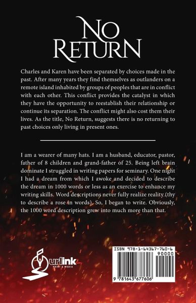 Charles and Karen have been separated by choices made in the past. After many years they find themselves as outlanders on a remote island inhabited by groups of peoples that are in conflict with each other. This conflict provides the catalyst in which they have the opportunity to reestablish their relationship or continue its separation. The conflict might also cost them their lives. As the title, No Return, suggests there is no returning to past choices only living in present ones.