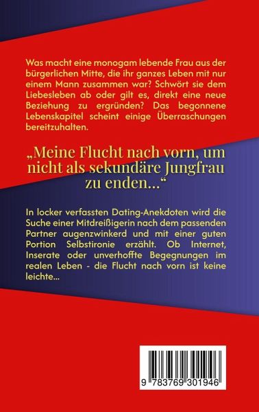 Was macht eine monogam lebende Frau aus der bürgerlichen Mitte, die ihr ganzes Leben mit nur einem Mann zusammen war? Schwört sie dem Liebesleben ab oder gilt es, direkt eine neue Beziehung zu ergründen? Das begonnene Lebenskapitel scheint einige Überraschungen bereitzuhalten. In locker verfassten Dating-Anekdoten wird die Suche einer Mitdreißigerin nach dem passenden Partner augenzwinkerd und mit einer guten Portion Selbstironie erzählt. Ob Internet, Inserate oder unverhoffte Begegnungen im realen Leben - die Flucht nach vorn ist keine leichte...