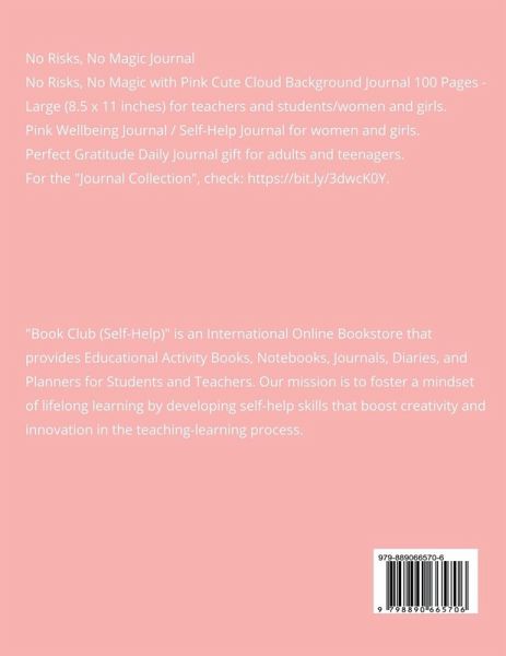 No Risks, No Magic Journal Pink Cute Cloud Background 100 Pages Large Size (8.5 x 11 inches) Unleash your creativity and embrace the magic within you! This adorable journal is perfect for dreamers, doers, and anyone ready to take bold steps in life. Features: Design: Beautiful pink clouds with a dreamy, inspiring vibe. Size: Large (8.5 x 11 inches) - perfect for sketches, notes, or journaling. Pages: 100 lined pages to capture your thoughts, ideas, and goals. Inspiration: Carry the reminder - No Risks, No Magic - wherever you go! Whether you're journaling, planning, or doodling, this notebook will keep you inspired every step of the way. Perfect as a gift or for personal use. Start your magical journey today!