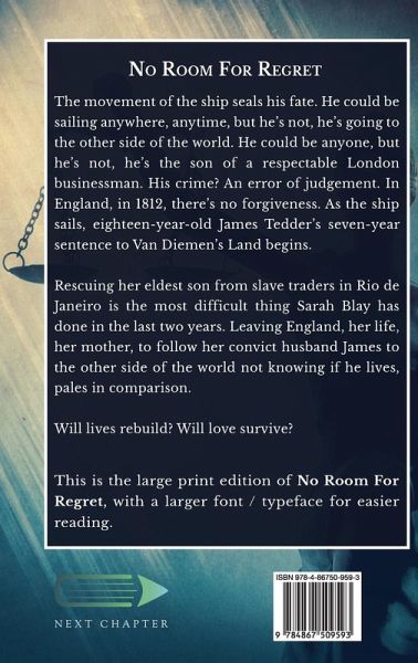 The movement of the ship seals his fate. He could be sailing anywhere, anytime, but he's not, he's going to the other side of the world. He could be anyone, but he's not, he's the son of a respectable London businessman. His crime? An error of judgement. In England, in 1812, there's no forgiveness. As the ship sails, eighteen-year-old James Tedder's seven-year sentence to Van Diemen's Land begins. Rescuing her eldest son from slave traders in Rio de Janeiro is the most difficult thing Sarah Blay has done in the last two years. Leaving England, her life, her mother, to follow her convict husband James to the other side of the world not knowing if he lives, pales in comparison. Will lives rebuild? Will love survive? This is the large print edition of No Room For Regret, with a larger font / typeface for easier reading.¿