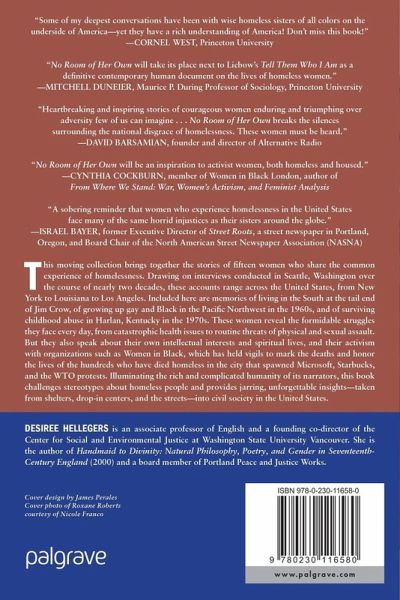 "No Room of Her Own is a gift to readers who want to understand the lives of women who have no home. Hellegers provides a platform for each woman to tell her story in her own vivid, heart wrenching language. As I read the book I felt as if I trudged uphill with each woman as she searched for a place to shower, a chance at a job a safe bed - or even a doorway - for the night. Any image I had of homelessness as a position of inert helplessness has been dispelled by reading the stories of women on the move to improve their situations. Violence, depression and anger are potent parts of the women s struggles. External threats to safety and health frequently erode confidence. But hope and courage regularly rise up to triumph over despair." Ginny Nicarthy, author of Getting Free: You Can End Abuse and Take Back Your Life "The reality that sings out from Desiree Hellegers' remarkable book is that women who lack a roof to sleep under at night are not lacking in competence, will-power, a way with words and a generous spirit of activism. The first-hand stories gathered here, framed by Hellegers' cogently political introduction, show how in the USA's grossly class-divided, racist and sexist society, housing is not a right but a privilege. Homelessness is a punishment for being already disadvantaged. No Room of Her Own will be an inspiration to activist women, both homeless and housed." Cynthia Cockburn, feminist research and writer, member of Women in Black London. Author of From Where We Stand: War, Women's Activism and Feminist Analysis (2007)"Desiree Hellegers presents fifteen heart-wrenching portraits of the lives of homeless and formerly homeless women. These women s stories are not sanitized to elicit sympathy from the reader. Rather, Hellegers offers us multidimensional narratives that resist the objectifying tendencies of other portrayals of the un-housed. In doing so, she aids the women s persistent struggle to assert value in their lives in the midst of
