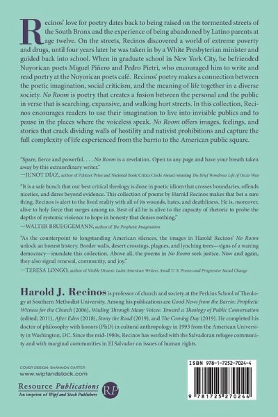 Recinos' love for poetry dates back to being raised on the tormented streets of the South Bronx and the experience of being abandoned by Latino parents at age twelve. On the streets, Recinos discovered a world of extreme poverty and drugs, until four years later he was taken in by a White Presbyterian minister and guided back into school. When in graduate school in New York City, he befriended Nuyorican poets Miguel Pinero and Pedro Pietri, who encouraged him to write and read poetry at the Nuyorican poets cafe. Recinos' poetry makes a connection between the poetic imagination, social criticism, and the meaning of life together in a diverse society. No Room is poetry that creates a fusion between the personal and the public in verse that is searching, expansive, and walking hurt streets. In this collection, Recinos encourages readers to use their imagination to live into invisible publics and to pause in the places where the voiceless speak. No Room offers images, feelings, and stories that crack dividing walls of hostility and nativist prohibitions and capture the full complexity of life experienced from the barrio to the American public square.