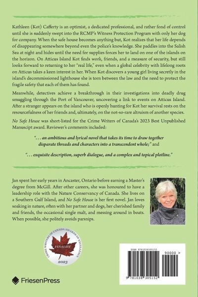 NO SAFE HOUSE is set on the south coast of British Columbia. Kathleen (Kot) Cafferty is an optimist and a dedicated professional who is rather fond of control - until she is suddenly swept into the RCMP's Witness Protection Program with only her dog, Medley, for company. When the safe house becomes anything but, Kot realizes that she has to disappear on her own terms -somewhere not even the police can find her. Late at night, she and Medley escape into the Salish Sea, sleeping rough until the need for supplies forces her to paddle towards one of the larger islands on the horizon. On Atticus Island, Kot finds work, friends, and a measure of security, but she still looks forward to returning to her "real life" When she discovers an abused orphan living secretly in the island's decommissioned lighthouse, Kot is torn between the law and the need to protect the fragile safety that each of them has found. Life takes another unexpected turn when a global celebrity with lifelong roots on Atticus takes a keen interest in her. Meanwhile, detectives achieve a breakthrough in their investigations into deadly drug smuggling through the Port of Vancouver, and uncover unexpected links to events on Atticus Island. When a stranger arrives who is openly hunting for Kot, her survival rests on the resourcefulness of her friends and, ultimately, on the not-so-rare altruism of another species. No Safe House was short-listed for the Crime Writers of Canada's 2023 Best Unpublished Manuscript Award. Reviewer's comments included: "...an ambitious and lyrical novel that takes its time to draw together disparate threads and characters into a transcendent whole" "...exquisite description, superb dialogue and a complex and topical plotline."
