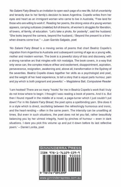 'No Salami Fairy Bread is an invitation to open each page of a new life, full of uncertainty and tenacity due to her family's decision to leave Argentina. Copello writes from her eyes and heart as an immigrant woman who came to live in Australia, "Free land for those who are willing to work it'. Reading her poems, the strong voice of a young woman appears, carrying suitcases (maletas) full of dreams, of women's struggles for liberation, of lovers, of family, of education. "Let's take a photo, for posterity", said the husband. "She looks beyond the camera, beyond the husband, / Beyond the present to a time / when dreams come true."' - Juan Garrido Salgado, poet 'No Salami Fairy Bread is a moving series of poems that chart Beatriz Copello's migration from Argentina to Australia and subsequent coming of age as a young wife, mother and modern woman. The book is a powerful story of loss and discovery, with a strong narrative arc that mingles with rich nostalgia. The book covers, in a way that only verse can, the complex mixture of fear and excitement, disappointment, aspiration, perseverance, resignation, awakening and, above all, transformation in the Sydney of the seventies. Beatriz Copello draws together her skills as a psychologist and poet, and the weight of her lived experience, to tell a story that is equal parts humour, pain and joy which is both poignant and powerful.' - Magdalena Ball, Compulsive Reader 'I am hooked! There are so many "hooks" for me in Beatriz Copello's work that I truly do not know where to begin. I thought I was reading a book of poems. And it is. But then I found myself in the middle of a novel, a page-turner which I just couldn't put down! For in No Salami Fairy Bread, the poet spins a spellbinding yarn. She does it in a style which is direct, oscillating between the refreshingly humorous and ironic, and the heart-rending - often in the same poem. The intensity can be unsettling at times. But even in such situations, the poet does not let you fall, rather beautifully balancing you by her utmost integrity, hued by pinches of humour - even in dark situations. I dare you pick this volume up and put it down before its last reflective poem.' - Daniel Lonita, poet