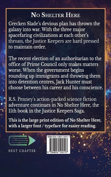 Grecken Slade's devious plan has thrown the galaxy into war. With the three major spacefaring civilizations at each other's throats, the Justice Keepers are hard pressed to maintain order. The recent election of an authoritarian to the office of Prime Council only makes matters worse. When the government begins rounding up immigrants and throwing them into detention centres, Jack Hunter must choose between his career and his conscience. R.S. Penney's action-packed science fiction adventure continues in No Shelter Here, the 11th book in the Justice Keepers Saga. This is the large print edition of No Shelter Here, with a larger font / typeface for easier reading.