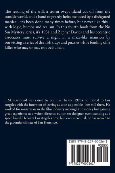 The reading of the will, a storm swept island cut off from the outside world, and a band of greedy heirs menaced by a disfigured maniac - it's been done many times before, but never like this - with logic, humor and realism. In this fourth book from the No Sin Mystery series, it's 1931 and Zephyr Davies and his eccentric associates must survive a night in a maze-like mansion by outwitting a series of devilish traps and puzzles while fending off a killer who may or may not be human.