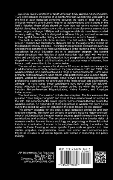No Small Lives: Handbook of North American Early Women Adult Educators, 1925-1950 contains the stories of 26 North American women who were active in the field of adult education sometime between the years of 1925 and 1950. Generally, women's contributions have been omitted from the field's histories. No Small Lives is designed to address this gap and restore women to their rightful place in the history of adult education in North America. The primary audience for this book is adult education professors and their graduate students. This book can be used in courses including history and sociology of adult education, the adult learner, courses specific to exploring women's contributions and activities. The secondary audience is the broader fields of women's studies, feminist history, sociology and psychology or those fields that include an examination of women in the early twentieth century. It could also be useful to those focusing on more specific topics such as gender and race studies, prejudice, marginalization, power, how women were sometimes portrayed as invisible or as central figures, and women in leadership and policy making.