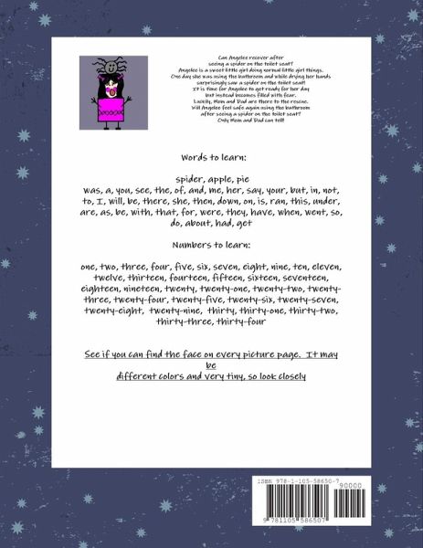 Can Angelee recover after seeing a spider on the toilet seat? Angelee is a sweet little girl doing normal little girl things. One day she was using the bathroom and while drying her hands surprisingly saw a spider on the toilet seat! It is time for Angelee to get ready for her day but instead becomes filled with fear. Luckily, Mom and Dad are there to the rescue. Will Angelee feel safe again using the bathroom after seeing a spider on the toilet seat? Only Mom and Dad can tell! Words to learn: spider, apple, pie was, a, you, see, the, of, and, me, her, say, your, but, in, not, to, I, will, be, there, she, then, down, on, is, ran, this, under, are, as, be, with, that, for, were, they, have, when, went, so, do, about, had & get See if you can find the face on every picture page. It may be different colors and very tiny, so look closely!