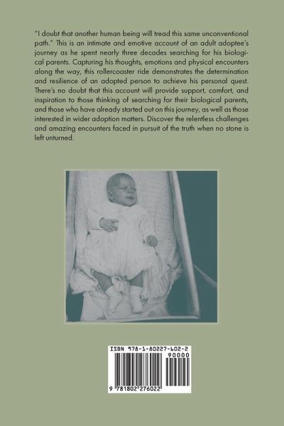 "I doubt that another human being will tread this same unconventional path." This is an intimate and emotive account of an adult adoptee's journey as he spent nearly three decades searching for his biological parents. Capturing his thoughts, emotions and physical encounters along the way, this rollercoaster ride demonstrates the determination and resilience of an adopted person to achieve his personal quest. There's no doubt that this account will provide support, comfort, and inspiration to those thinking of searching for their biological parents, and those who have already started out on this journey, as well as those interested in wider adoption matters. Discover the relentless challenges and amazing encounters faced in pursuit of the truth when no stone is left unturned.