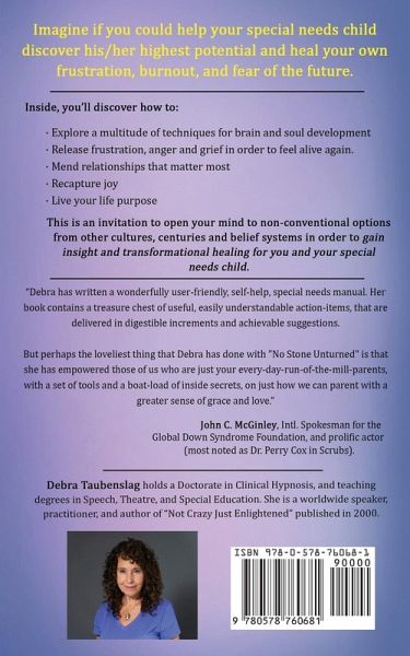 ATTENTION: Parents of Special Needs Children WHAT IF A MESSAGE SO POWERFUL COULD CHANGE YOUR LIFE, RIGHT NOW, BY HELPING YOU RELEASE: 1. Hopelessness, Sadness, and Anger 2. Exhaustion on All Levels of Your Being; Physical, Mental, Emotional and Spiritual 3. Fear of the Future 4. Neglected Needs of Self WOULD YOU WANT TO HEAR IT? Imagine if you could help your special needs child discover his/her highest potential while healing your own frustration, burnout, and all the other feelings you might keep inside. No Stone Unturned: How My Special Needs Child and I Transformed Against All Odds is a 35-year odyssey exploring a multitude of health and healing modalities. When Debra was given a severe prognosis of her son's future, she quickly discovered that combining both conventional and non-conventional methods from other cultures, centuries, and belief systems were the answers that held the key to unlocking the unused portion of his brain. In the process, her son discovered his purpose for surviving and healed in miraculous ways. His mom Debra also changed in the process and discovered her purpose as well. Together they moved from fear and impossibility to freedom. This is more than just a story of transformation. It is a memoir of a regular mom and her special needs kid who shares her intimate story of struggle and triumph in order to teach others how they did it. This is an invitation to explore another way of coping and interpreting your experience. If you are ready to learn that your mind, thoughts, and intention are more powerful than you could ever imagine, and that you truly do hold all your answers within, then this book is for you. Review From: Dena Buonarota Russell NJ Special Needs Connection http://www.njspecialneedsconnection.com/">http://www.njspecialneedsconnection.com Your book was wonderful. I read all the time so I am a fast reader :) Got through it in two days. Congratulations! Simply wonderful. No Stone Unturned is an uplifting story of Dr. Taubenslag's inspirational life journey to rediscover her identity and her purpose after giving birth to a child with special needs. Leaving no stone unturned, she embarks on a lifelong adventure crossing religious, spiritual and social boundaries to find her way. Joining her on this journey is her son, Nick. Together, they are transformed through their beautiful and sometimes unconventional experiences. Throughout the decades, Dr. Taubenslag continues to use what she has learned to help heal herself and her son, and she shares with us these valuable life lessons in this beautifully written memoir. No Stone Unturned is a heartfelt story that will capture your heart and open your mind to new experiences. It celebrates the unwavering determination of one Mother on a mission to restore her faith and rebuild her life. It also explores the diverse opportunities available to those on a similar journey. We all take different paths to our destination. Dr. Taubenslag, though her sincere motivation and encouragement, can help you find your way should you get lost.