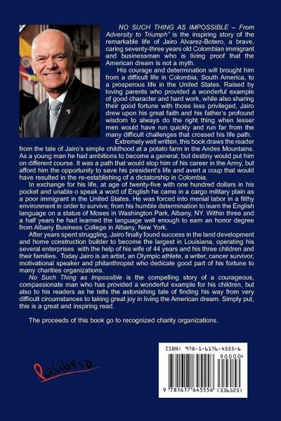 NO SUCH THING AS IMPOSSIBLE - From Adversity to Triumph" is the inspiring story of the remarkable life of Jairo Alvarez-Botero, a brave, caring seventy-three years old Colombian immigrant and businessman who is living proof that the American dream is not a myth. His courage and determination will brought him from a difficult life in Colombia, South America, to a prosperous life in the United States. Raised by loving parents who provided a wonderful example of good character and hard work, while also sharing their good fortune with those less privileged, Jairo drew upon his great faith and his father's profound wisdom to always do the right thing when lesser men would have run quickly and run far from the many difficult challenges that crossed his life path. Extremely well written, this book draws the reader from the tale of Jairo's simple childhood at a potato farm in the Andes Mountains. As a young man he had ambitions to become a general, but destiny would put him on different course. It was a path that would stop him of his career in the Army, but afford him the opportunity to save his president's life and avert a coup that would have resulted in the re-establishing of a dictatorship in Colombia. In exchange for his life, at age of twenty-five with one hundred dollars in his pocket and unable o speak a word of English he came in a cargo military plain as a poor immigrant in the United States. He was forced into menial labor in a filthy environment in order to survive; from his humble determination to learn the English language on a statue of Moses in Washington Park, Albany, NY. Within three and a half years he had learned the language well enough to earn an honor degree from Albany Business College in Albany, New York. After years spent struggling, Jairo finally found success in the land development and home construction builder to become the largest in Louisiana, operating his several enterprises with the help of his wife of 44 years and his three children and their families. Today Jairo is an artist, an Olympic athlete, a writer, cancer survivor, motivational speaker and philanthropist who dedicate good part of his fortune to many charities organizations. No Such Thing as Impossible is the compelling story of a courageous, compassionate man who has provided a wonderful example for his children, but also to his readers as he tells the astonishing tale of finding his way from very difficult circumstances to taking great joy in living the American dream. Simply put, this is a great and inspiring read. The proceeds of this book go to recognized charity organizations.
