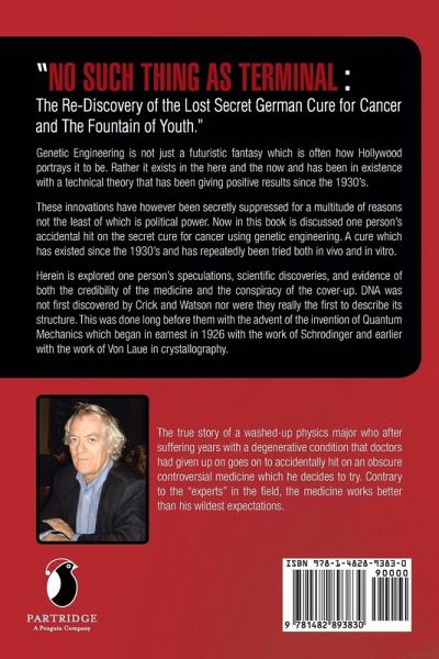 "No Such Thing as Terminal : The Re-Discovery of the Lost Secret German Cure for Cancer and The Fountain of Youth. " Genetic Engineering is not just a futuristic fantasy which is often how Hollywood portrays it to be. Rather it exists in the here and the now and has been in existence with a technical theory that has been giving positive results since the 1930's. These innovations have however been secretly suppressed for a multitude of reasons not the least of which is political power. Now in this book is discussed one person's accidental hit on the secret cure for cancer using genetic engineering. A cure which has existed since the 1930's and has repeatedly been tried both in vivo and in vitro. Herein is explored one person's speculations, scientific discoveries, and evidence of both the credibility of the medicine and the conspiracy of the cover-up. DNA was not first discovered by Crick and Watson nor were they really the first to describe its structure. This was done long before them with the advent of the invention of Quantum Mechanics which began in earnest in 1926 with the work of Schrodinger and earlier with the work of Von Laue in crystallography.