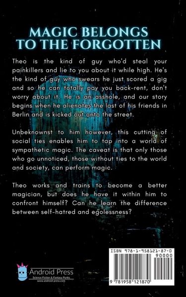 Theo is the kind of guy who'd steal your painkillers and lie to you about it while high. He's the kind of guy who swears he just scored a gig and so he can totally pay you back-rent, don't worry about it. He is an asshole, and our story begins when he alienates the last of his friends in Berlin and is kicked out onto the street. Unbeknownst to him however, this cutting of social ties enables him to tap into a world of sympathetic magic, which he does by accidentally teleporting to China. There, he meets a mentor named Gabriel, who instructs him in the art of sympathy, in the art of seeing things as similar to allow them to become the same. The caveat is that only those who go unnoticed, those without ties, can perform magic. Gabriel brings Theo to an enclave of magicians, who perform global charity work at the margins of society. As he works with them and trains to become a better magician, Theo is forced to confront himself, and to learn the difference between self-hatred and egolessness, with an ultimately tragic conclusion. One part Neverwhere, one part Bojack Horseman, with more than a dash of Ursula Le Guin, this is a story about the magical thinking within modernity, and the importance of self-compassion in trying to make the world a better place.