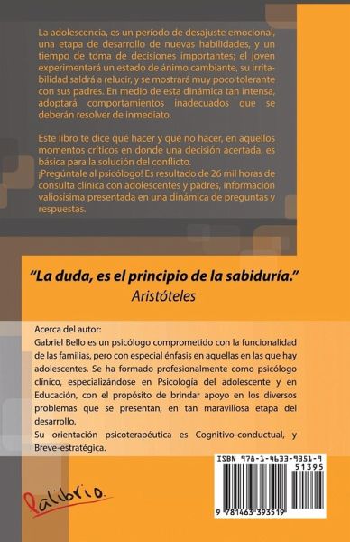La adolescencia es un período de desajuste emocional, una etapa de desarrollo de nuevas habilidades y un tiempo de toma de decisiones importantes. El joven experimentará un estado de ánimo cambiante, su irritabilidad saldrá a relucir y se mostrará muy poco tolerante con sus padres. En medio de esta dinámica tan intensa, adoptará comportamientos inadecuados que se deberán resolver de inmediato. Este libro te dice qué hacer y qué no hacer en aquellos momentos críticos en donde una decisión acertada es básica para la solución del conflicto. No te quedes con la duda; ¡Pregúntale al psicólogo! Es resultado de veintiséis mil horas de consulta clínica con adolescentes y padres, información valiosísima presentada en una dinámica de preguntas y respuestas.