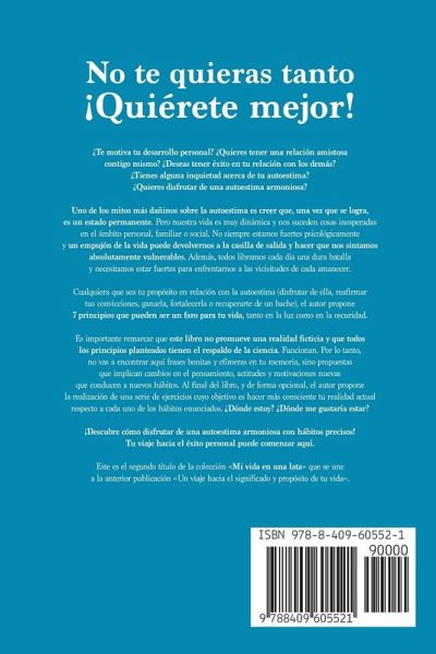 Este es el segundo título de la colección Mi vida en una lata que se une a la anterior publicación Un viaje hacia el significado y propósito de tu vida. No te quieras tanto. ¡Quiérete mejor! 7 hábitos para disfrutar de una autoestima armoniosa ¿Te motiva tu desarrollo personal? ¿Quieres tener una relación amistosa contigo mismo? ¿Deseas tener éxito en tu relación con los demás? ¿Tienes alguna inquietud acerca de tu autoestima? ¿Quieres disfrutar de una autoestima armoniosa? Uno de los mitos más dañinos sobre la autoestima es creer que, una vez que se logra, es un estado permanente. Pero nuestra vida es muy dinámica y nos suceden cosas inesperadas en el ámbito personal, familiar o social. No siempre estamos fuertes psicológicamente y un empujón de la vida puede devolvernos a la casilla de salida y hacer que nos sintamos absolutamente vulnerables. Además, todos libramos cada día una dura batalla y necesitamos estar fuertes para enfrentarnos a las vicisitudes de cada amanecer. Cualquiera que sea tu propósito en relación con la autoestima (disfrutar de ella, reafirmar tus convicciones, ganarla, fortalecerla o recuperarte de un bache), el autor propone 7 principios que pueden ser un faro para tu vida, tanto en la luz como en la oscuridad. Es importante remarcar que este libro no propone una realidad ficticia, ya que todos los principios propuestos tienen el respaldo de la ciencia. Funcionan. Por lo tanto, no vas a encontrar aquí frases bonitas y efímeras en tu memoria, sino propuestas que implican cambios en el pensamiento, actitudes y motivaciones nuevas que conducen a nuevos hábitos. Al final del libro, y de forma opcional, el autor recomienda la realización de una serie de ejercicios cuyo objetivo es hacer más consciente tu realidad actual en relación con los hábitos que modelan la autoestima y pasar a la acción, si lo crees necesario. ¿Dónde estoy? ¿Dónde me gustaría estar? ¡Descubre cómo disfrutar de una autoestima armoniosa con hábitos precisos! Tu viaje hacia el éxito personal puede comenzar aquí.