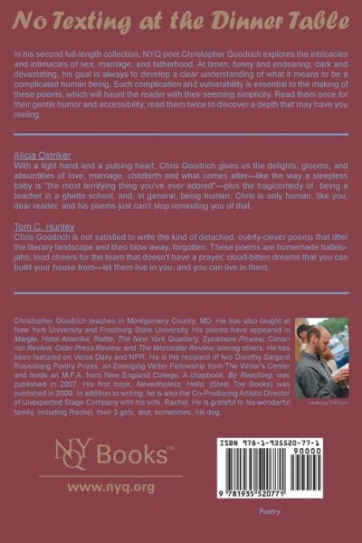 In his second full-length collection, NYQ poet Christopher Goodrich explores the intricacies and intimacies of sex, marriage, and fatherhood. At times, funny and endearing, dark and devastating, his goal is always to develop a clear understanding of what it means to be a complicated human being. Such complication and vulnerability is essential to the making of these poems, which will haunt the reader with their seeming simplicity. Read them once for their gentle humor and accessibility, read them twice to discover a depth that may have you reeling.