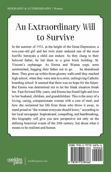 Imagine being just 2 years old, your twin sister by your side, both clinging to your beloved Father as he leads you to an ominous brick building: St. Vincent's Orphanage. It was the Summer of 1933, the country was in the Great Depression, and it was the Summer when Emma and her Sister, Wanna, were left at the gloomy home for girls. Even as they begged their Father not to leave, crying helplessly, arms outstretched: he still shut the door. They spent their childhood within the walls of the grim orphanage, separated from their brothers as well, until they reached High School age, where they were sent to a strict, unforgiving Catholic Boarding School. It seemed like there was no hope for any kind of bright future…. Emma, however, was determined that her bleak situation would not bring her down. Fast-forward 50 years, Emma has once again found her light and love in her husband, children and grandchildren. A true testimonial that with faith, and hope, your life can still change. Even through adversity, things will always work out.