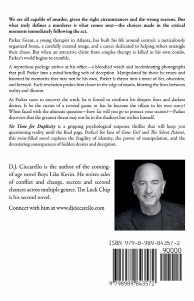 We are all capable of murder, given the right circumstances and the wrong reasons. But what truly defines a murderer is what comes next-the choices made in the critical moments immediately following the act. Parker Grant, a young therapist in Atlanta, has built his life around control: a meticulously organized home, a carefully curated image, and a career dedicated to helping others untangle their chaos. But when an attractive client from couples therapy is killed in his own condo, Parker's world begins to crumble. A mysterious package arrives at his office-a bloodied watch and incriminating photographs that pull Parker into a mind-bending web of deception. Manipulated by those he trusts and haunted by memories that may not be his own, Parker is thrust into a maze of lies, obsession, and betrayal. Each revelation pushes him closer to the edge of mania, blurring the lines between reality and illusion. As Parker races to uncover the truth, he is forced to confront his deepest fears and darkest desires. Is he the victim of a twisted game, or has he become the villain in his own story? When faced with the ultimate question-how far will you go to protect your secrets?-Parker discovers that the greatest threat may not lie in the shadows but within himself. No Time for Duplicity is a gripping psychological suspense thriller that will keep you questioning reality until the final page. Perfect for fans of Gone Girl and The Silent Patient, this twist-filled novel explores the fragility of identity, the power of manipulation, and the devastating consequences of hidden desires and deception.