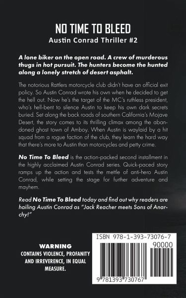 A lone biker on the open road. A crew of murderous thugs in hot pursuit. The hunters become the hunted along a lonely stretch of desert asphalt. The notorious Rattlers motorcycle club didn't have an official exit policy. So Austin Conrad wrote his own when he decided to get the hell out. Now he's the target of the MC's ruthless president, who's hell-bent to silence Austin to keep his own dark secrets buried. Set along the back roads of southern California's Mojave Desert, the story comes to its thrilling climax among the abandoned ghost town of Amboy. When Austin is waylaid by a hit squad from a rogue faction of the club, they learn the hard way that there's more to Austin than motorcycles and petty crime. No Time To Bleed is the action-packed second installment in the highly acclaimed Austin Conrad series. Quick-paced story ramps up the action and tests the mettle of anti-hero Austin Conrad, while setting the stage for further adventure and mayhem. Warning: contains violence, profanity and irreverence, in equal measure.