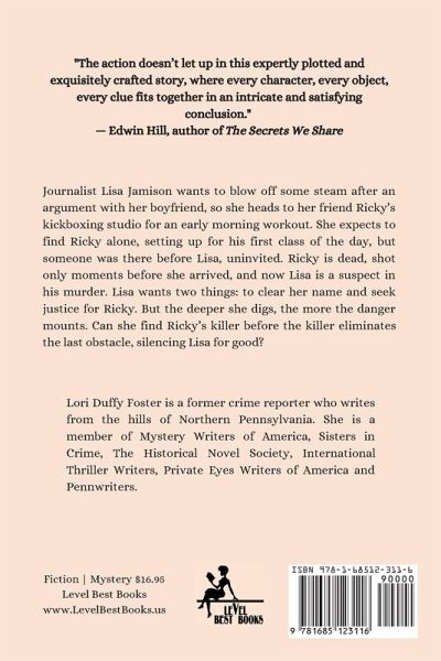 Journalist Lisa Jamison wants to blow off some steam after an argument with her boyfriend, so she heads to her friend Ricky's kickboxing studio for an early morning workout. She expects to find Ricky alone, setting up for his first class of the day, but someone was there before Lisa, uninvited. Ricky is dead, shot only moments before she arrived, and now Lisa is a suspect in his murder. Lisa wants two things: to clear her name and seek justice for Ricky. But the deeper she digs, the more the danger mounts. Can she find Ricky's killer before the killer eliminates the last obstacle, silencing Lisa for good?