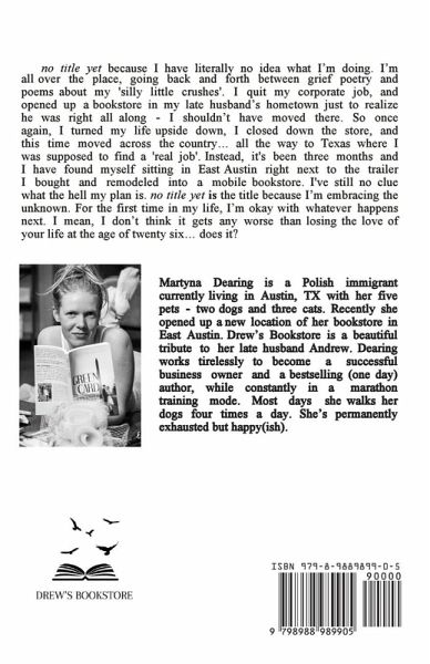 no title yet because I have literally no idea what I'm doing. I'm all over the place, going back and forth between grief poetry and poems about my 'silly little crushes'. I quit my corporate job, and opened up a bookstore in my late husband's hometown just to realize he was right all along - I shouldn't have moved there. So once again, I turned my life upside down, I closed down the store, and this time moved across the country... all the way to Texas where I was supposed to find a 'real job'. Instead, it's been three months and I have found myself sitting in East Austin right next to the trailer I bought and remodeled into a mobile bookstore. I still have no clue what the hell my plan is. no title yet is the title because I'm embracing the unknown. For the first time in my life, I'm okay with whatever happens next. I mean, I don't think it gets any worse than losing the love of your life at the age of 26... does it?