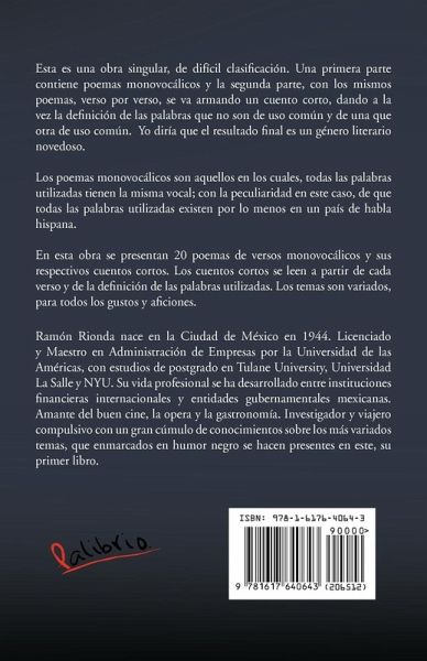 "This is a singular work that is difficult to classify. The first part contains monovocalic poems and the second part, with the same poems, verse by verse, builds up a short story, giving both the definition of the words that are not in common use and one that another in common use I would say that the end result is a novel literary genre. Monovocalic poems are those in which all the words used have the same vowel with the peculiarity in this case that all the words used exist in at least one country Spanish-speaking. This work presents 20 monovocalic verse poems and their respective short stories. The short stories are read from each verse and the definition of the words used. The themes are varied for all tastes and hobbies."--