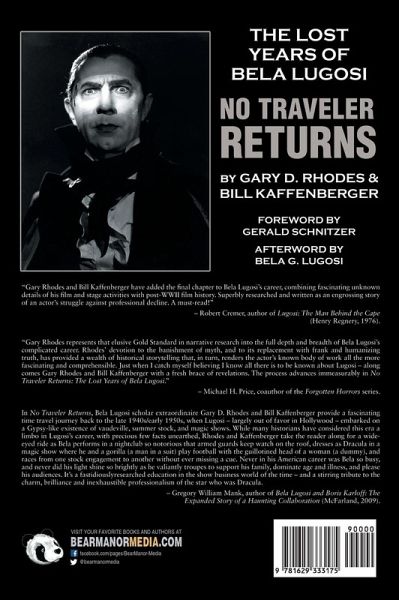 "Gary Rhodes and Bill Kaffenberger have added the final chapter to Bela Lugosi’s career, combining fascinating unknown details of his film and stage activities with post-WWII film history. Superbly researched and written as an engrossing story of an actor’s struggle against professional decline. A must-read!" – Robert Cremer, author of Lugosi: The Man Behind the Cape (Henry Regnery, 1976). "Gary Rhodes represents that elusive Gold Standard in narrative research into the full depth and breadth of Bela Lugosi’s complicated career. Rhodes’ devotion to the banishment of myth, and to its replacement with frank and humanizing truth, has provided a wealth of historical storytelling that, in turn, renders the actor’s known body of work all the more fascinating and comprehensible. Just when I catch myself believing I know all there is to be known about Lugosi — along comes Gary Rhodes and Bill Kaffenberger with a fresh brace of revelations. The process advances immeasurably in No Traveler Returns: The Lost Years of Bela Lugosi." – Michael H. Price, coauthor of the Forgotten Horrors series. In No Traveler Returns, Bela Lugosi scholar extraordinaire Gary D. Rhodes and Bill Kaffenberger provide a fascinating time travel journey back to the late 1940s/early 1950s, when Lugosi – largely out of favor in Hollywood – embarked on a Gypsy-like existence of vaudeville, summer stock, and magic shows. While many historians have considered this era a limbo in Lugosi’s career, with precious few facts unearthed, Rhodes and Kaffenberger take the reader along for a wide-eyed ride as Bela performs in a nightclub so notorious that armed guards keep watch on the roof, dresses as Dracula in a magic show where he and a gorilla (a man in a suit) play football with the guillotined head of a woman (a dummy), and races from one stock engagement to another without ever missing a cue. Never in his American career was Bela so busy, and never did his light shine so brightly as he valiantly troupes to support his family, dominate age and illness, and please his audiences. It’s a fastidiously researched education in the show business world of the time – and a stirring tribute to the charm, brilliance and inexhaustible professionalism of the star who was Dracula. – Gregory William Mank, author of Bela Lugosi and Boris Karloff: The Expanded Story of a Haunting Collaboration (McFarland, 2009).