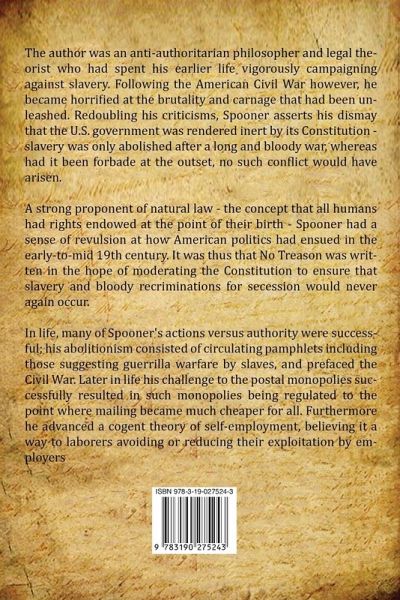 The author was an anti-authoritarian philosopher and legal theorist who had spent his earlier life vigorously campaigning against slavery. Following the American Civil War however, he became horrified at the brutality and carnage that had been unleashed. Redoubling his criticisms, Spooner asserts his dismay that the U.S. government was rendered inert by its Constitution - slavery was only abolished after a long and bloody war, whereas had it been forbade at the outset, no such conflict would have arisen. A strong proponent of natural law - the concept that all humans had rights endowed at the point of their birth - Spooner had a sense of revulsion at how American politics had ensued in the early-to-mid 19th century. It was thus that No Treason was written in the hope of moderating the Constitution to ensure that slavery and bloody recriminations for secession would never again occur. In life, many of Spooner's actions versus authority were successful; his abolitionism consisted of circulating pamphlets including those suggesting guerrilla warfare by slaves, and prefaced the Civil War. Later in life his challenge to the postal monopolies successfully resulted in such monopolies being regulated to the point where mailing became much cheaper for all. Furthermore he advanced a cogent theory of self-employment, believing it a way to laborers avoiding or reducing their exploitation by employers.