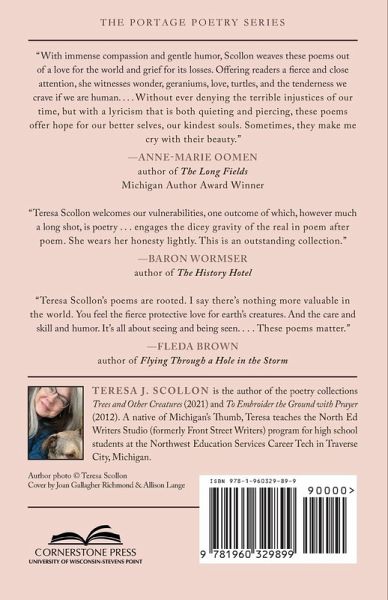 From Anne-Marie Oomen, Michigan Author Award Winner: "With immense compassion and gentle humor, Scollon weaves these poems out of a love for the world and grief for its losses. Offering readers a fierce and close attention, she witnesses wonder, geraniums, love, turtles, and the tenderness we crave if we are human. . . . Without ever denying the terrible injustices of our time, but with a lyricism that is both quieting and piercing, these poems offer hope for our better selves, our kindest souls. Sometimes, they make me cry with their beauty."