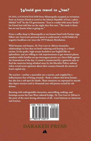 Would you travel to Iran? In 2010, a schoolteacher from Minneapolis accepted an invitation from an Iranian friend to travel to the Islamic Republic of Iran, a place labeled "evil" by the US government. "Iran is a snake with many heads," his friend had told him on the night they first met. "The mask is there, but no one knows what is going on." From a coffee shop in Minneapolis to tea houses lined with Persian rugs, follow one American's personal quest to understand a world hidden by negative headlines ever since the 1979 Islamic Revolution. With honesty and humor, No True Love in Tehran chronicles relationships in Iran that are both enduring and fraying in a closed society. In the parks, high-octane bachelors use English like an aphrodisiac and are willing to risk imprisonment to get women's phone numbers while families set up extravagant picnics as a force field against the frustrations of the day. A crowd is mesmerized by a guitarist only to find the musician being whisked away by the Morality Police; subway riders reveal secret opinions about their country beneath the streets of Iran's capital city. The teacher-neither a journalist nor a tourist, and crippled by a hallucinatory fear of being arrested-finds a culture that loves beauty, but also has a soft spot for death. These emotions are expressed in murals that depict martyrs and in thousand-year-old poems recited by cab drivers. In this entertaining reflection on the culture of the Middle East, we are taken on hikes up the mountains surrounding Tehran to talk with ordinary Iranians who look down at a heartsick city-one that clings to life on the border of tradition and modernity. Bursting with unforgettable characters, storytelling, seeking, and footsteps across the East-West cultural bridge, No True Love in Tehran, is the story of the most daring adventure of all-trust between an American and Iranian.