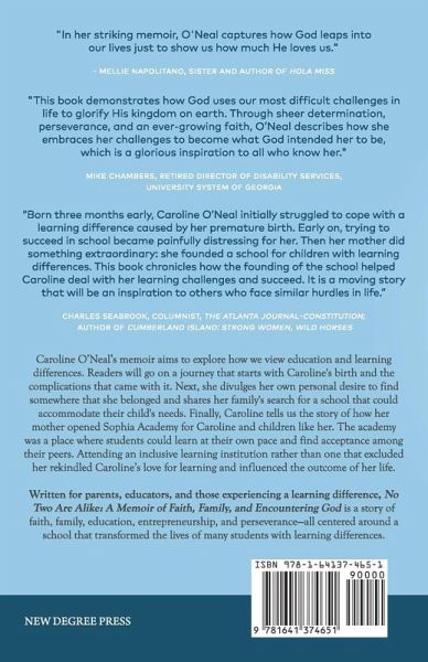 Caroline O'Neal's memoir aims to explore how we view education and learning differences. Readers will go on a journey that starts with Caroline's birth and the complications that came with it. Next, she divulges her own personal desire to find somewhere that she belonged and shares her family's search for a school that could accommodate their child's needs. Finally, Caroline tells us the story of how her mother opened Sophia Academy for Caroline and children like her. The academy was a place where students could learn at their own pace and find acceptance among their peers. Attending an inclusive learning institution rather than one that excluded her rekindled Caroline's love for learning and influenced the outcome of her life. Written for parents, educators, and those experiencing a learning difference, No Two Are Alike: A Memoir of Faith, Family, and Encountering God is a story of faith, family, education, entrepreneurship, and perseverance--all centered around a school that transformed the lives of many students with learning differences.
