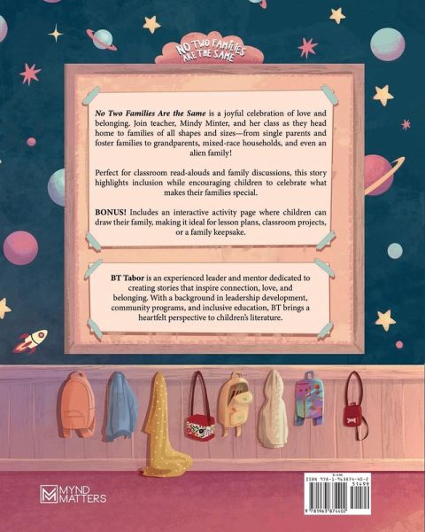 "Every family is wonderfully different-and beautifully special."In No Two Families Are the Same, teacher Mindy Minter sends her students home to families as unique as they are-grandparents, loving single parents, caring foster homes, vibrant blended families, and even an imaginative alien family beaming up to their spaceship!This rhyming picture book highlights the beauty of love and belonging in all its forms. With vivid storytelling and an interactive activity page, children are encouraged to celebrate their own families while learning about others.Perfect for classroom discussions, bedtime reading, and interactive learning, this story inspires empathy, creativity, and connection.For educators and parents, No Two Families Are the Same offers a meaningful tool to start conversations about family, identity, and acceptance while reinforcing themes of love and care.For readers ages 3-8, No Two Families Are the Same is a joyful celebration of what makes each family unique. Add this must-have story to your bookshelf today and inspire conversations that celebrate who we are!