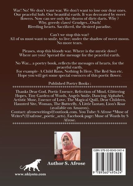 War! No! We don't want war. We don't want to lose our dear ones. Our peaceful hub. Our beautiful earth. It was decorated by sweet flowers. Now can see only the thorns of dirty darts. Why ? Why, greedy claws? Grudges...Ouch! Bleeding hearts. Sacrificed, the desired paradise. Can't we stop this war? All of us must want to smile, to live; under the shadow of sweet moon. No more tears. Pleases, stop this bloody war. Where is the mystic dove? Where are you? Spread the message for the peaceful earth. No War... a poetry book, reflects the messages of hearts, for the peaceful earth. For example- A Child Runs, Nothing Is Here, The Red Sun etc. Hope you will get some special essences of this poetic flower. Published Poetry Books : ******************************************************* Thanks Dear God, Poetic Essence, Refection of Mind, Glittering Hopes, Tiny Garden of Words, Angels Smile, Dancing Alphabet, Artistic Muse, Essence of Love, The Magical Quill, Dear Children, Haunted Site, Woman, The Butterfly, A Little fantasy, Lion's Roar (available on Amazon). Contact: afrosewritings@outlook.com. You Tube: S Afrose *Muse of Writes*(@safrose_poetic_arts), Facebook page: Muse of Words by S Afrose. *******************************************************