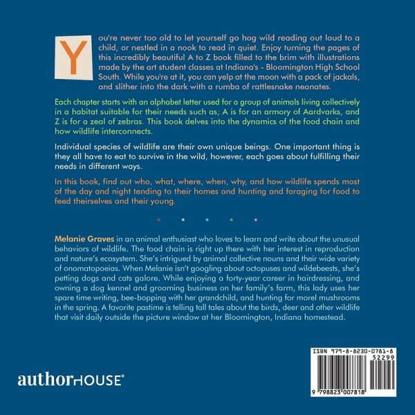 You're never too old to let yourself go hog wild reading out loud to a child, or nestled in a nook to read in quiet. Enjoy turning the pages of this incredibly beautiful A to Z book filled to the brim with illustrations made by the art student classes at Indiana's - Bloomington High School South. While you're at it, you can yelp at the moon with a pack of jackals, and slither into the dark with a rumba of rattlesnake neonates. Each chapter starts with an alphabet letter used for a group of animals living collectively in a habitat suitable for their needs such as; A is for an armory of Aardvarks, and Z is for a zeal of zebras. This book delves into the dynamics of the food chain and how wildlife interconnects. Individual species of wildlife are their own unique beings. One important thing is they all have to eat to survive in the wild, however, each goes about fulfilling their needs in different ways. In this book, find out who, what, where, when, why, and how wildlife spends most of the day and night tending to their homes and hunting and foraging for food to feed theirselves and their young.