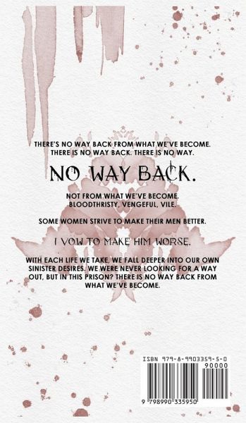 THERE'S NO WAY BACK FROM WHAT WE'VE BECOME. There is no way back. There is no way. No way back. Not from what we've become; Bloodthirsty, vengeful, vile. Some women strive to make their men better, I VOW TO MAKE HIM WORSE. With each life we take, we fall deeper into our own sinister desires. We were never looking for a way out, but in this prison? There is no way back from what we've become.